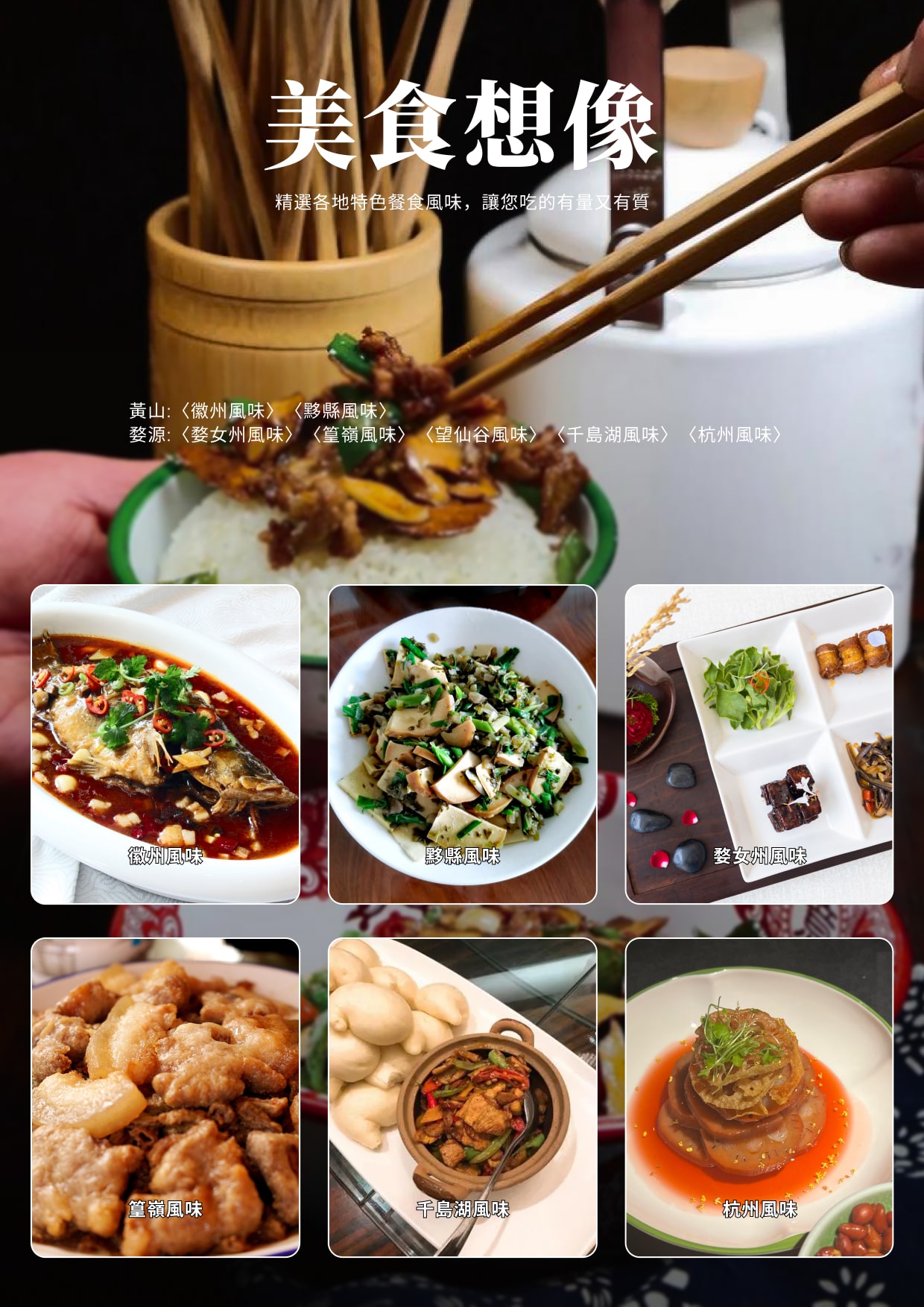 〈九華山風味RMB80〉〈黃山山上自助RMB160-180〉〈屯溪風味RMB80〉〈農家風味RMB60〉〈婺女州風味RMB80〉〈篁嶺風味RMB60〉〈杭州特色風味RMB120〉