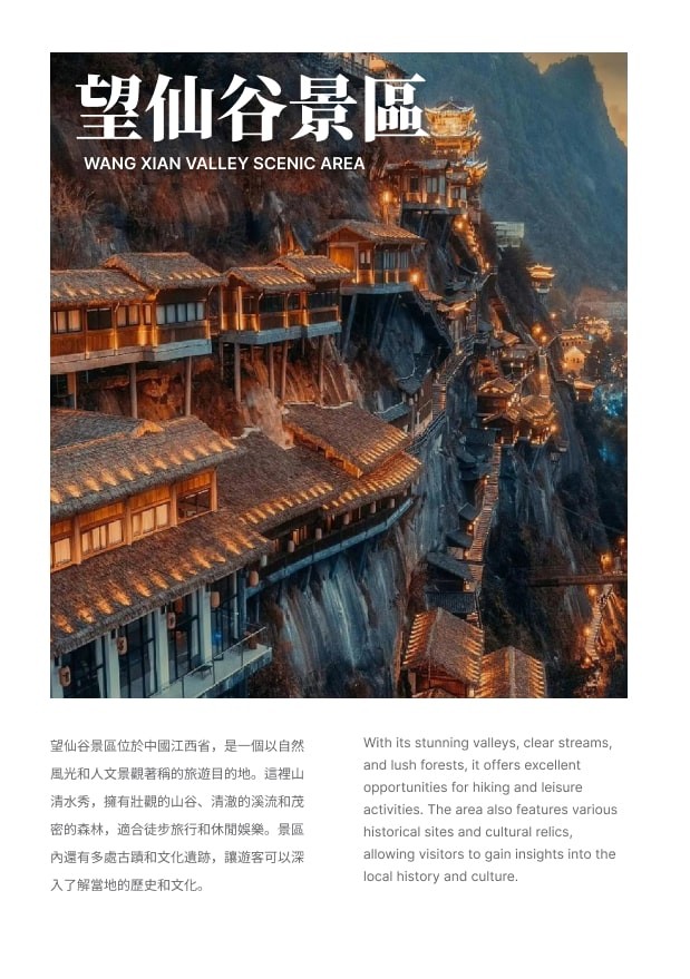 ★【望仙谷景區】依山形而建、沿峽谷成街,以棧道串聯的模式,鑲嵌在懸崖之上,【高空玻璃棧道】【望仙瀑布】【許願橋】【美食街】【岩鋪】等都完全融入了山川和峽谷的視覺流線中。