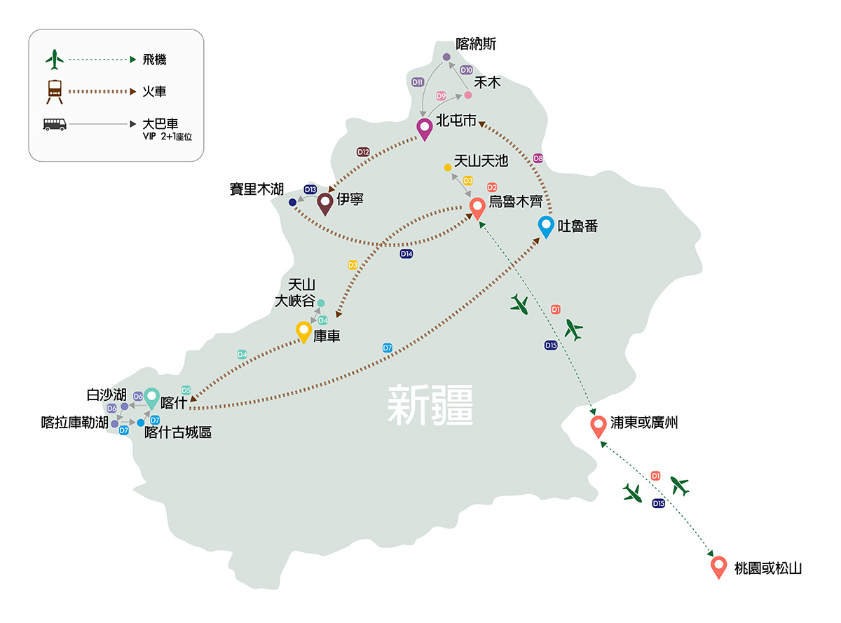 3.交通:新東方快車高端旅遊列車+陸地空調旅遊大巴(全程VIP 2+1用車,天池/喀納斯為景區直通車、那拉提景區包車)。