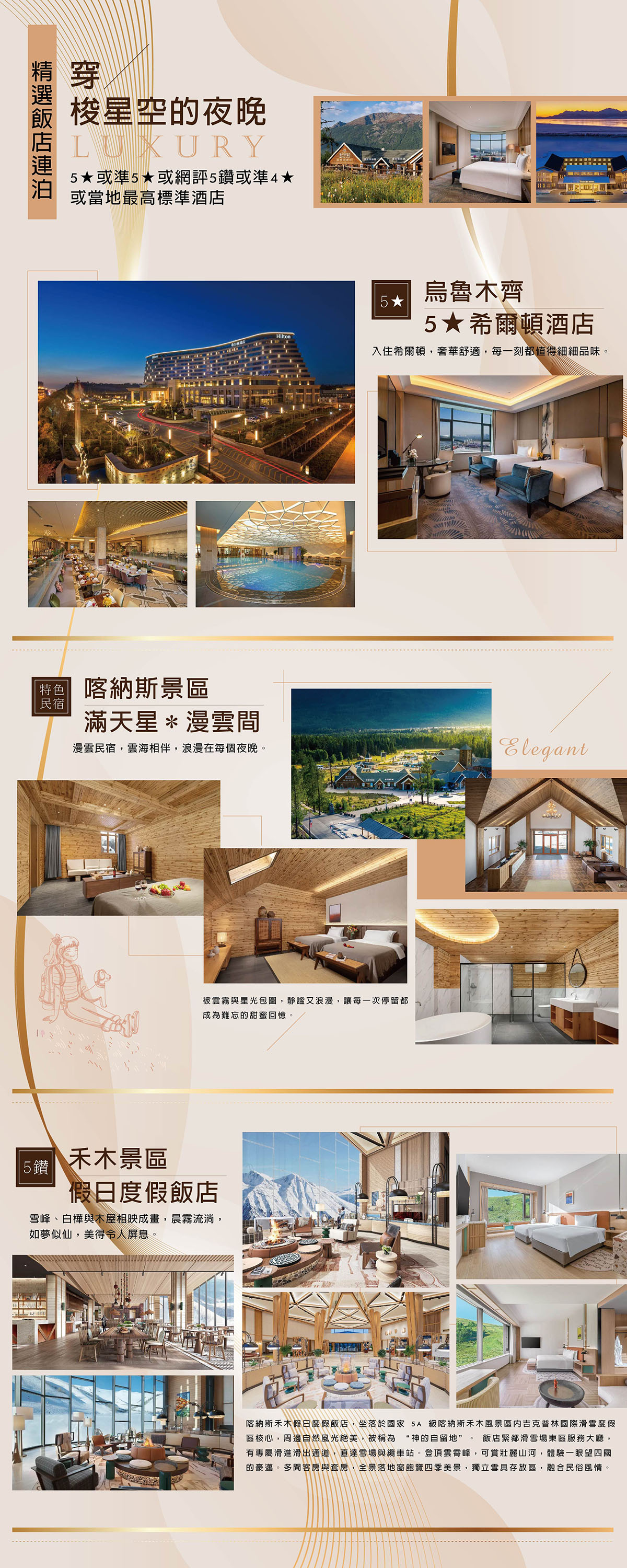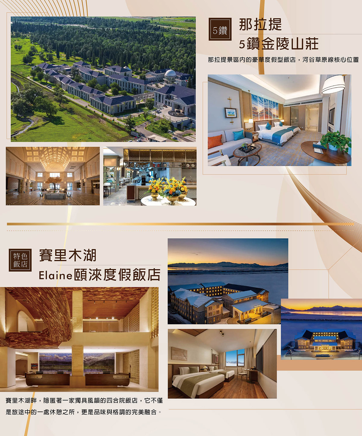 ※住宿精選:5★或準5★或網評5鑽或準4★或當地最高標準酒店,及當地特色民宿(含喀纳斯圖瓦人小木屋,賽里木湖湖邊及那拉提景區内住宿)享受旅遊新方式