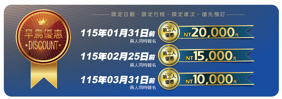 (1)收取旅遊定金後如因個人原因取消,定金不予退還NT120,000元/人;