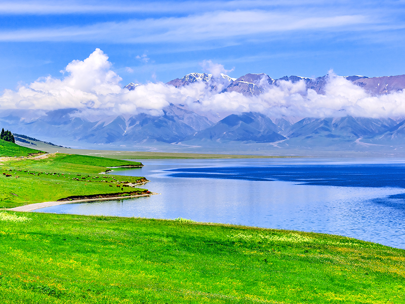 古稱西方淨海,是新疆海拔最高、面積最大的高山冷水湖。因是大西洋的暖濕氣流最後眷顧的地方,所以被稱作大西洋最後一滴眼淚,海西草原,鮮花滿地。黃的花、紫的花、紅的花、萬紫千紅;近處碧水藍天,波光粼粼,遠處白雪皚皚共長天一色,儼然一幅水彩畫。