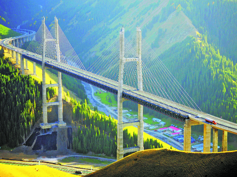 果子溝是伊黎河穀的門戶,白雲藍天,雪山松樹,峰迴路轉,風光旖旎。全部採用鋼桁梁結構,使用國內特殊專用橋樑鋼材17000噸,並採用高強螺栓連接,安裝精度控制在兩毫米以內。大橋是自治區公路第一座斜拉橋,也是國內第一座公路雙塔雙索面鋼桁梁斜拉橋。