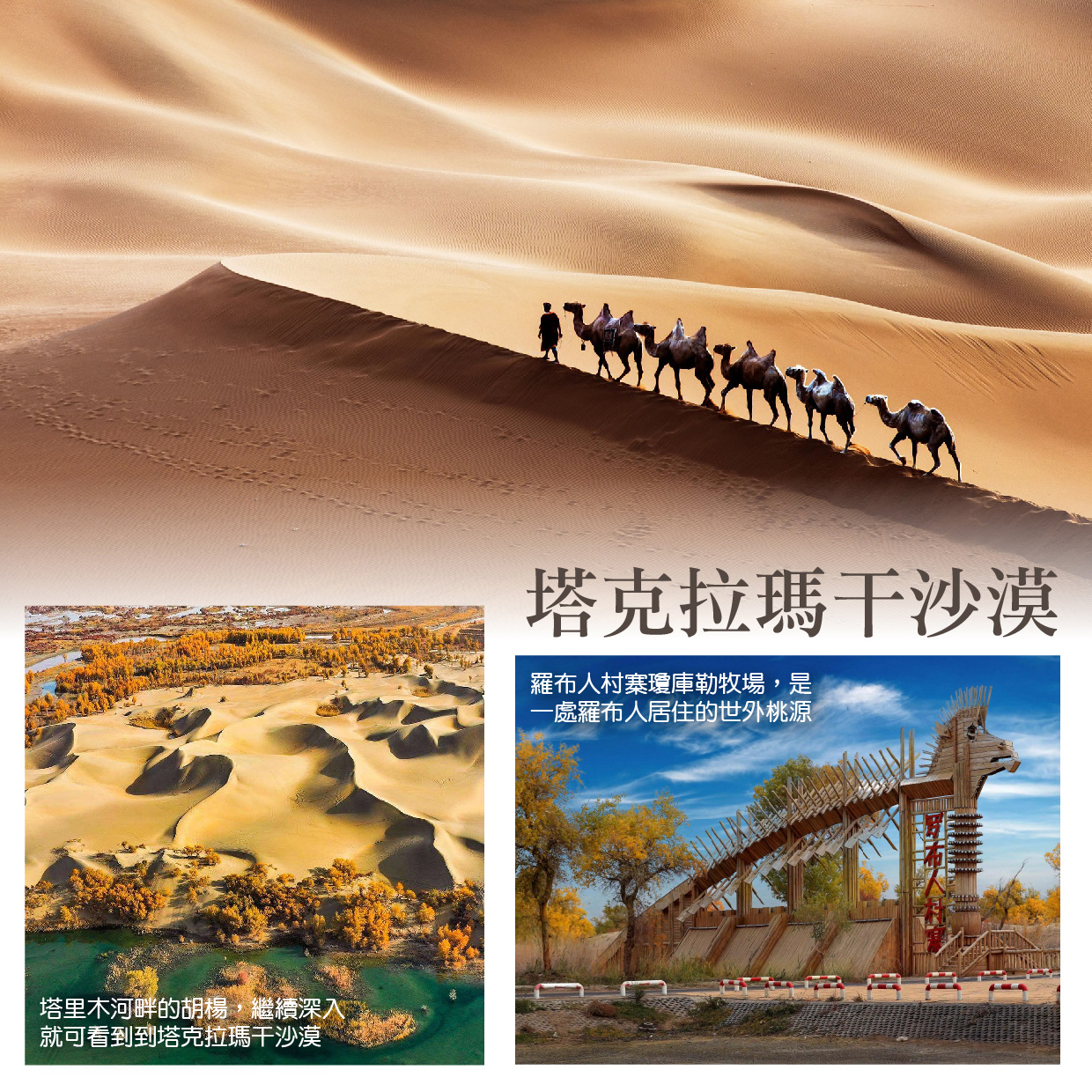 我們往裡繼續深入,可以看見大片大片的塔里木河畔的胡楊,然後就到達了浩渺無邊的“中國首位的大沙漠”【塔克拉瑪幹沙漠】這裡可以騎駱駝(個人娛樂項目,費用自理)。