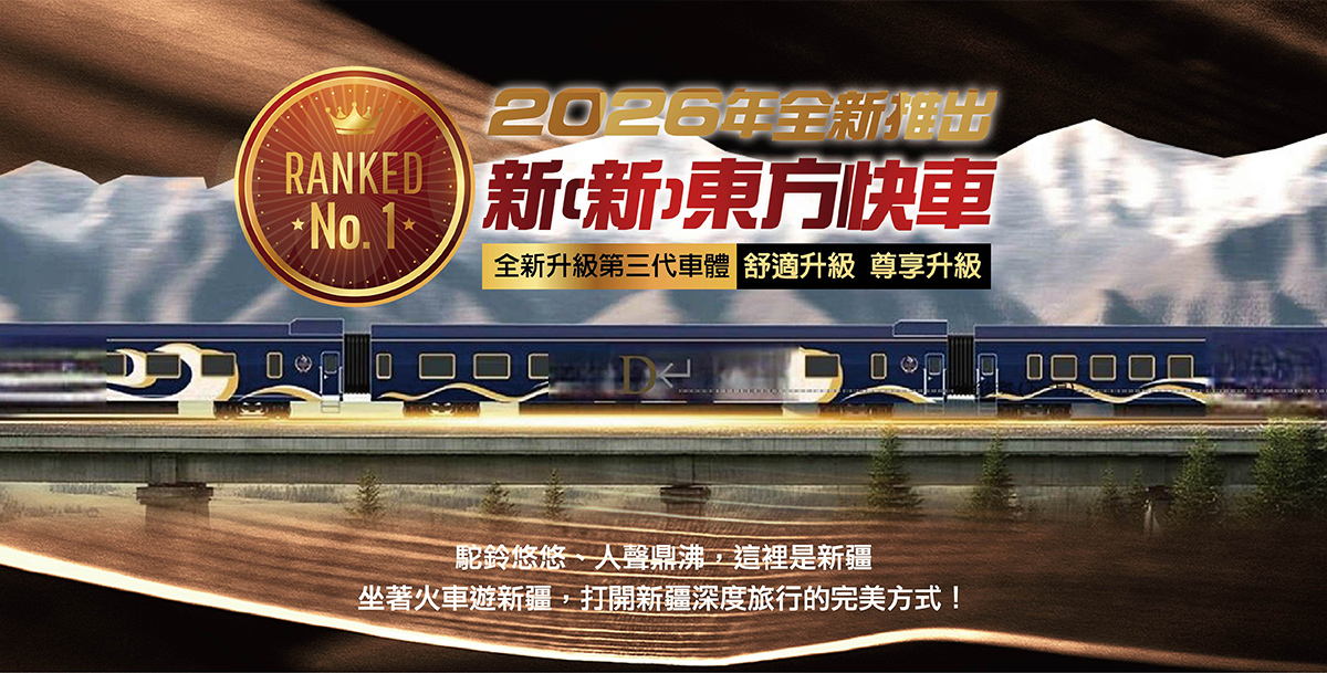 【新東方快車】是高端旅遊列車,“坐著火車遊新疆” 您才能真正享受南北疆的美。2026年第三代新東方快車多種房型滿足您與家人的多元化需求!車體升級,服務升級,品質升級! 選擇搭專列:讓旅行從舟車勞頓變成享受沿途風景。清晨推開窗,看著天邊亮起的新疆晨光;晚上在車廂輕鬆聊天,隔天醒來就到下一站。