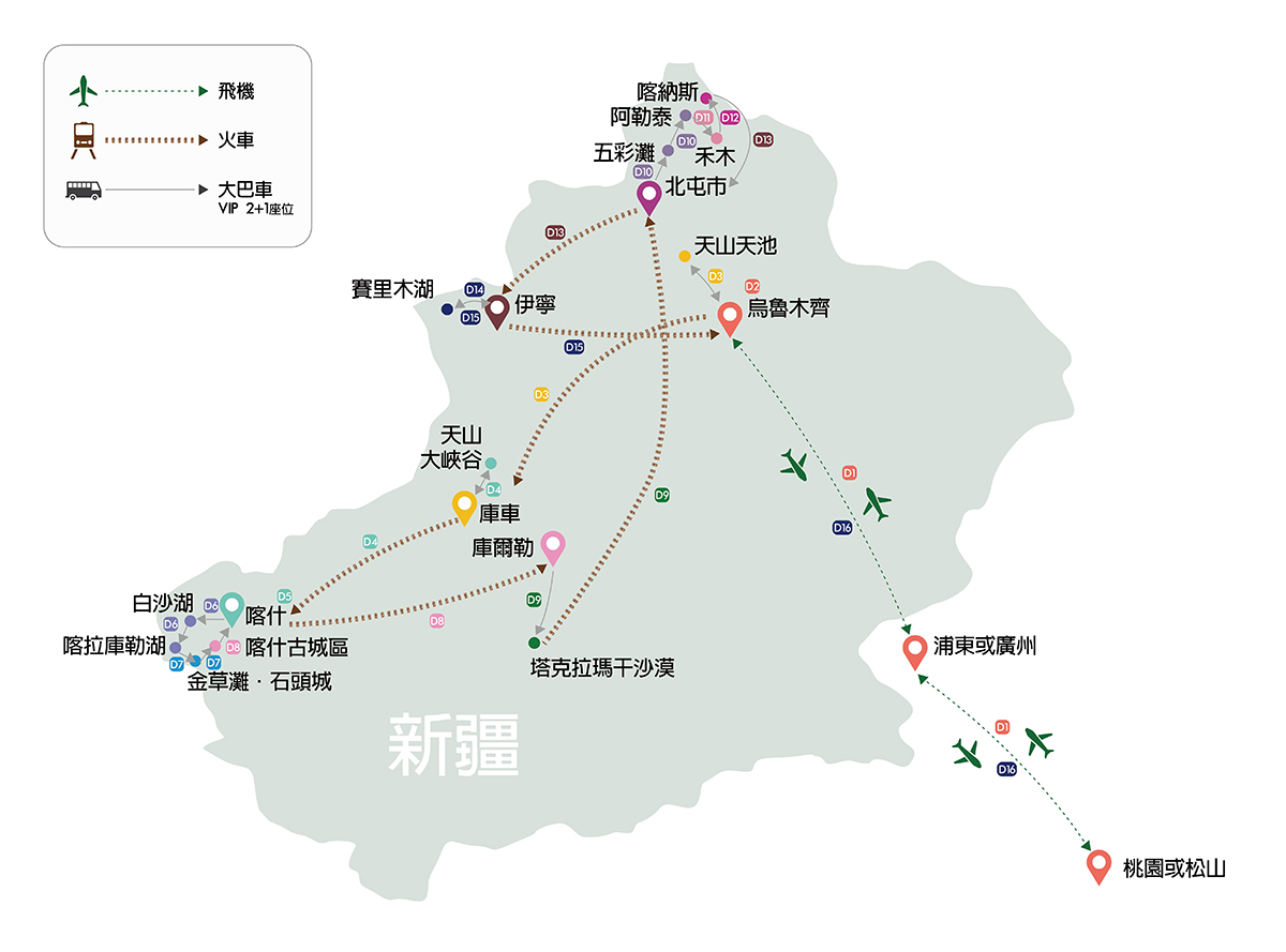 烏魯木齊搭乘飛機經上海或廣州轉成直航班機返回台灣,結束這15天新東方快車專列之旅,返回溫暖的家。