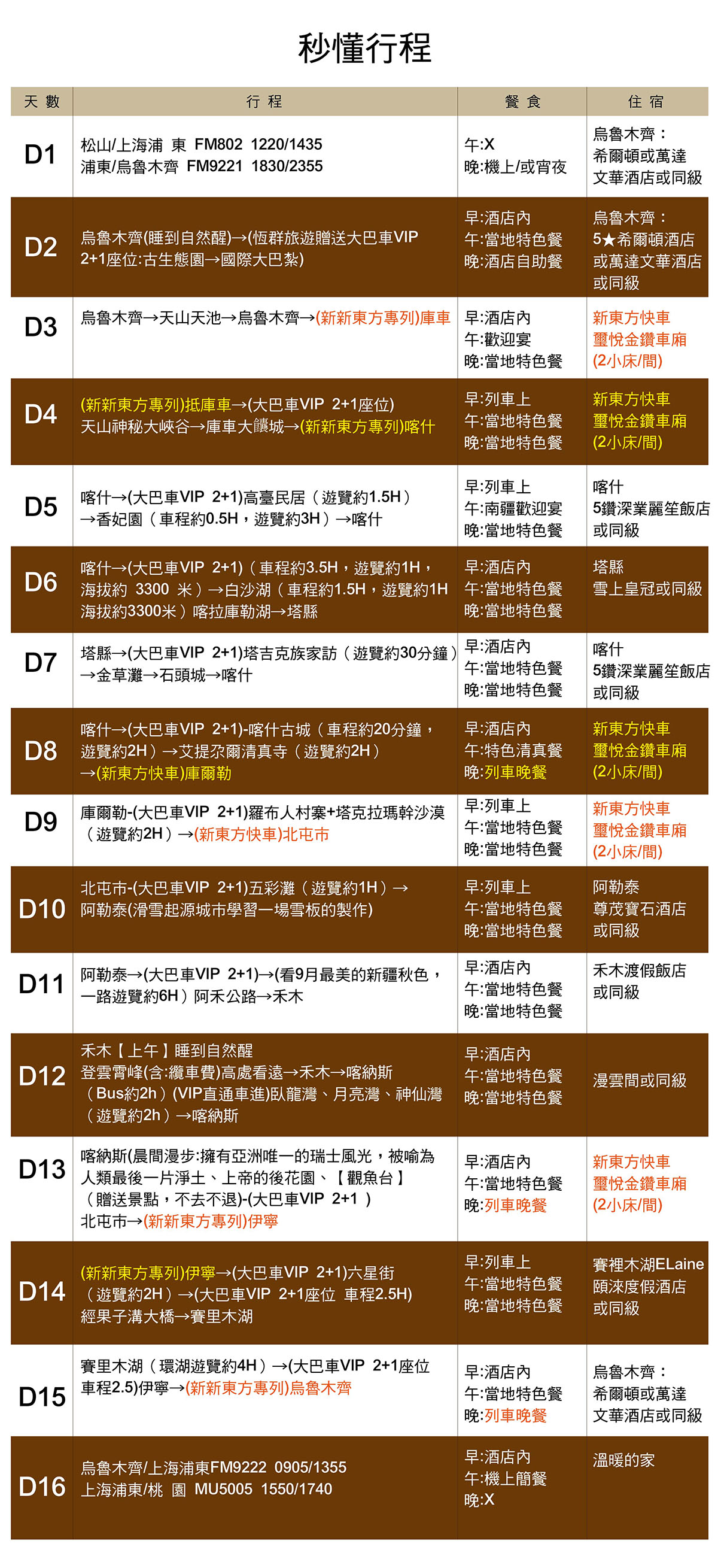 3.交通:新東方快車高端旅遊列車+陸地空調旅遊大巴(全程VIP 2+1用車,天池/喀納斯為景區直通車、那拉提景區包車)。