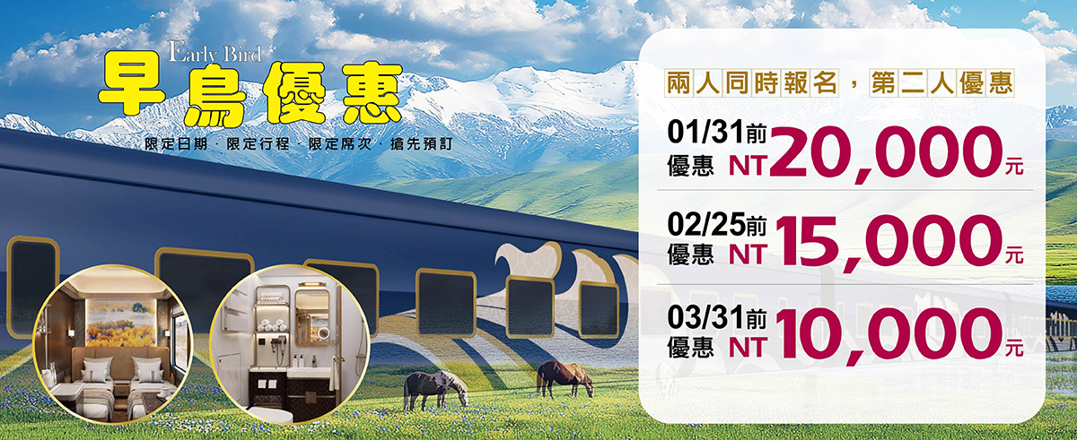2026/08/30(日) | 台北-松山機場出發 新(新)東方快車~2026全新升級 豪華「旅遊專列」-新疆南北疆域追秋色彩繽紛16日機位 20 候補0 已售0 可售19早鳥優惠第2人NT20000元/人 |